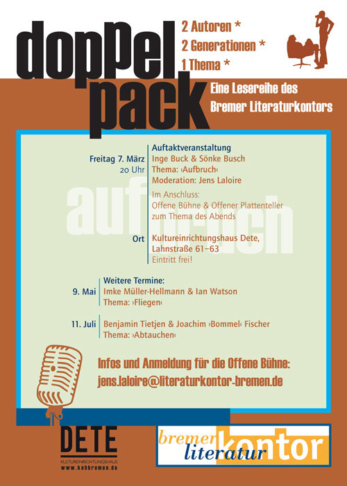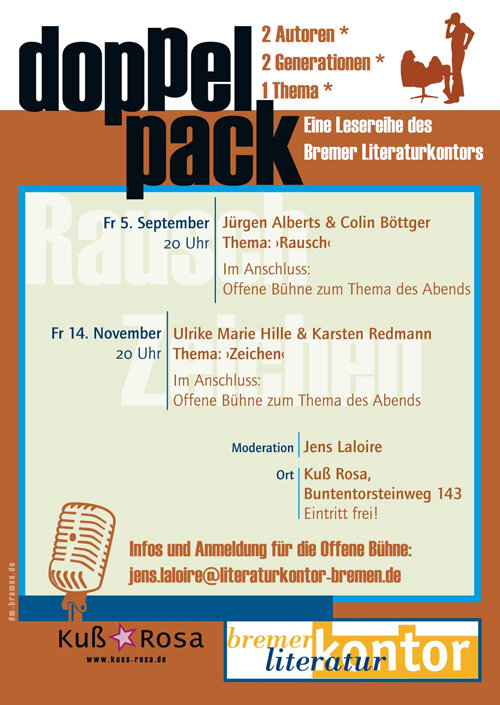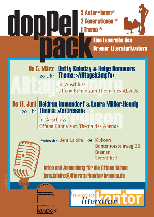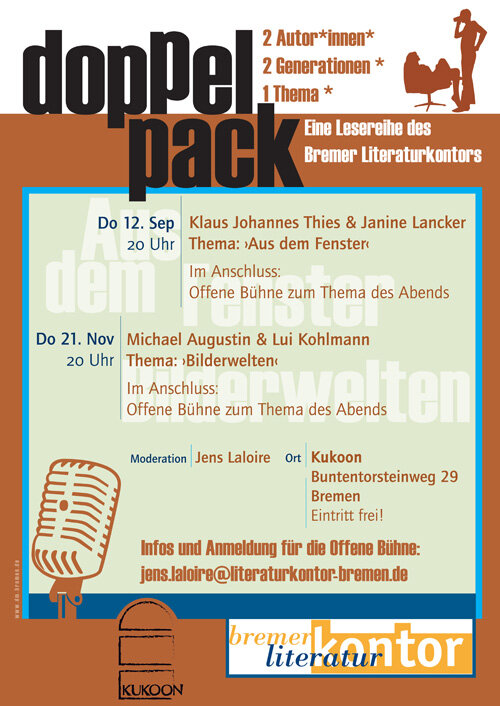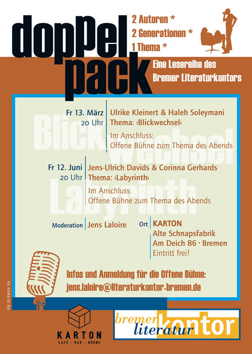Mit der Lesereihe Doppelpack hat das Bremer Literaturkontor 2014/15 regelmäßig jeweils zwei Autor*innen verschiedenen Alters an einem Abend zusammengebracht. Unter der Überschrift ›2 Autor*innen – 2 Generationen – ein Thema‹ gastierte die Lesereihe an verschiedenen Orten wie der Dete, dem Kuß Rosa oder dem Karton. Seit September 2019 legt das Literaturkontor die Lesereihe im Kukoon neu auf.